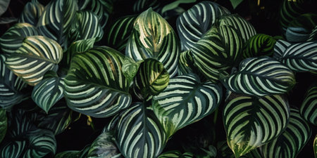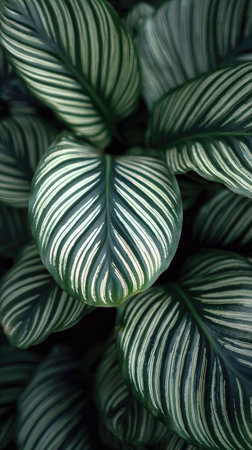 This image showcases detailed close-up views of Calathea Orbifolia leaves. The leaves exhibit striking patterns of alternating green and white stripes. The composition emphasizes texture and form, using soft lighting to highlight the intricate details. Suitable for illustrating concepts of nature and botanical studies, this image could serve commercial or editorial purposes.
