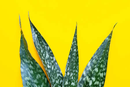 Sansevieria home plant stand on yellow background. Home gardening. Banner with copy space.