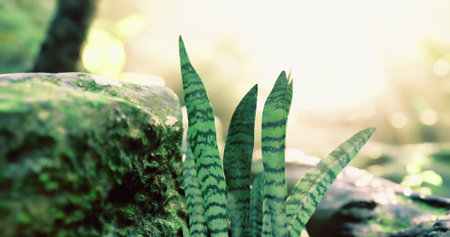Bright green leaves of a plant emerge from a moss covered stone, illuminated by warm sunlight filtering through a lush environment, creating an inviting and peaceful scene.