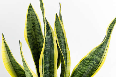 The leaves of the house plant Sansevieria on a white background. Home plant Sansevieria trifa. Selective focus.
