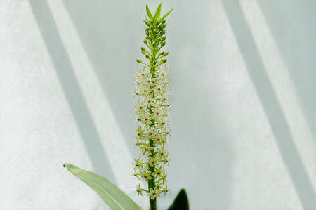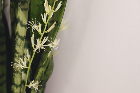 Snake plant blooming stem close up on background of white room. Sansevieria plant blooming flowers on stem and green striped leaves at white wall, copy space. Houseplant
