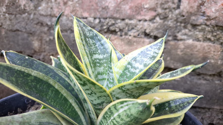 Striped Mother-in-law's Tongue's green leaf with golden edge (Sansevieria trifasciata cv.'Laurentii' ) Close up
