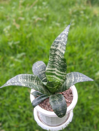 Close-up Sansevieria boncellensis (a dwarf sanseveria with compact thick leaves) in flower pots with green nature blurred background.