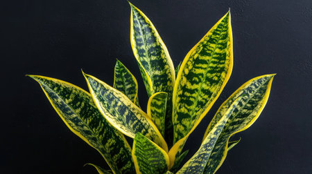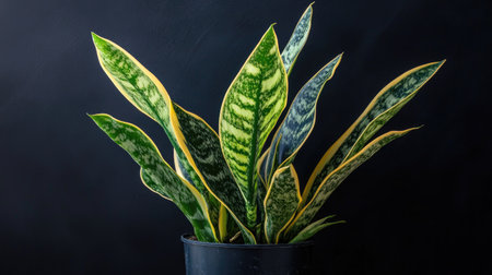A striking snake plant with vibrant green and yellow leaves stands out against a dark background, showcasing its unique texture and form, perfect for decor.