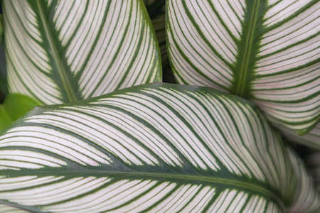 This image showcases a close-up view of Calathea Orbifolia leaves, displaying a striking pattern of white and green stripes. The composition highlights the natural textures and forms found in the plant, likely under natural or studio lighting. Suitable for use in various commercial applications, including editorial and design projects focused on nature.