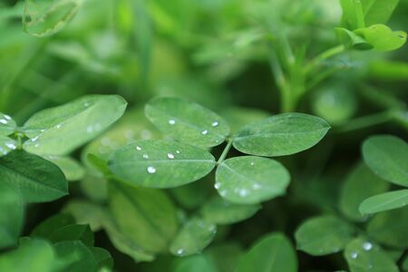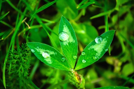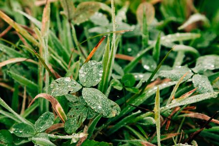 Green clover leaf with water drops close up. natural background.