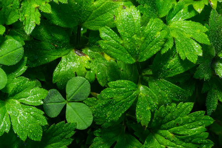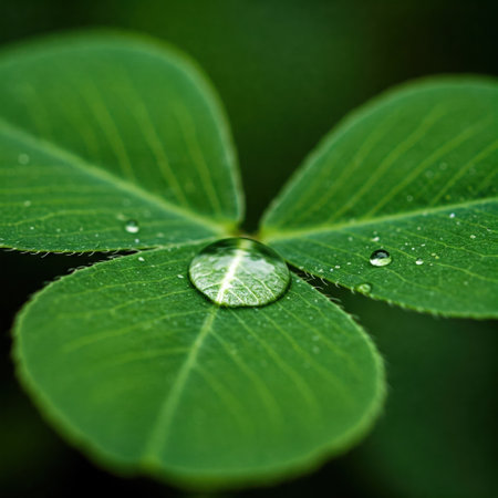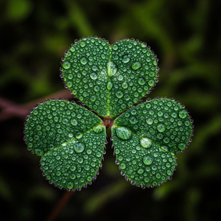 A captivating close-up view of a clover leaf adorned with droplets of water, showcasing rich greenery and natural beauty, perfect for nature lovers.