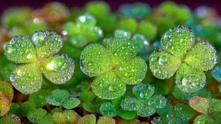 Close up of clover leaves with morning dew droplets highlighting texture