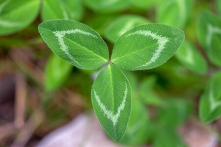 Lucky Irish Four Leaf Clover in the Field for St. Patricks Day holiday symbol. with three-leaved shamrocks.