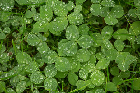 Close-up image of raindrops on three leaves clovers. Macro image green trefoil with drops of dew on petals. Saint patrick's holiday concept.