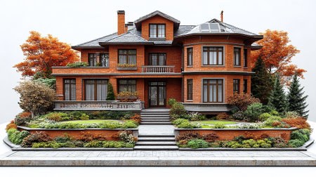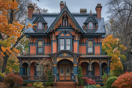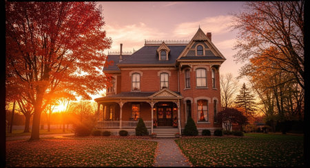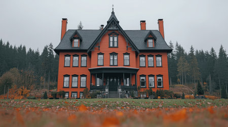 A stunning red Victorian mansion stands majestically against a backdrop of soft fog and vibrant autumn colors, reflecting beauty and heritage.