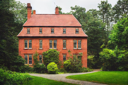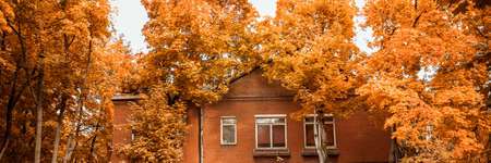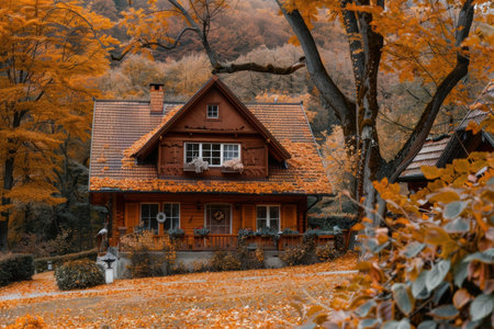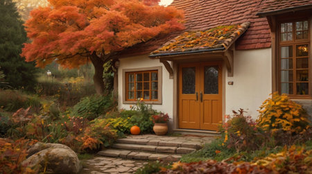 Autumn cottage in the English countryside style, old village architecture, autumnal nature beauty