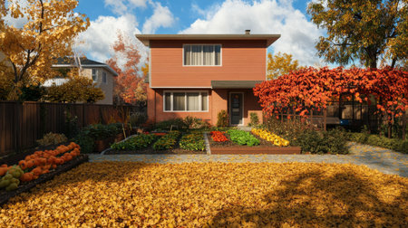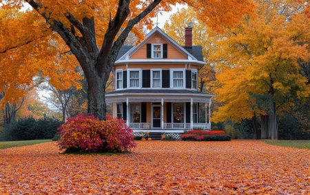 A lovely house adorned with a bright orange wreath welcomes visitors amid a spectacular display of autumn foliage. The red and yellow leaves blanket the lawn, creating a picturesque fall atmosphere in the neighborhood.