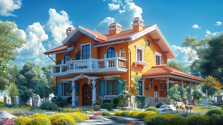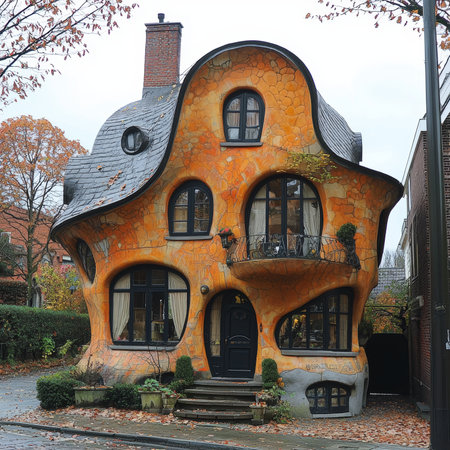 A charming house featuring imaginative curvilinear architecture, highlighted by its orange stone facade and elegant details, invokes a whimsical and artistic atmosphere perfect for storytelling or creative concepts.