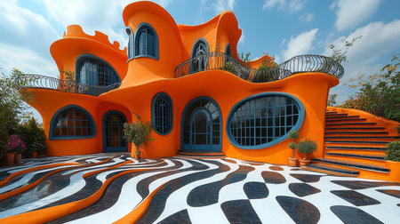 Eye-catching contemporary building with an orange facade, curved windows, and art-inspired black and white pattern on the ground, blending modern creativity, boldness, and functional aesthetics, perfect for unique architectural inspirations.