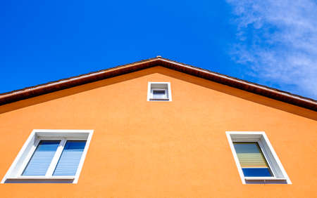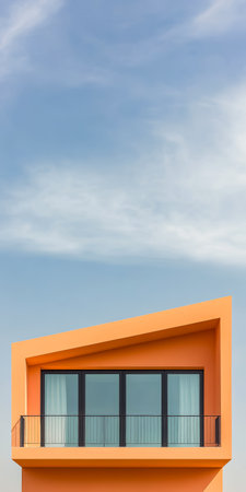 A striking orange building features a unique slanted roof and large windows with white curtains. It stands against a clear blue sky showcasing contemporary architecture and design.