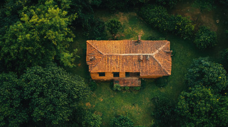 Stunning aerial view highlighting a red tiled roof atop a lush green lawn, surrounded by trees. Ideal for showcasing architecture and landscape design.