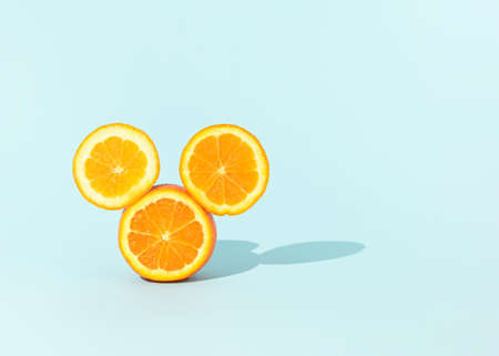 Orange slices with sunlight shadow against a bright blue background. Minimal food concept. Creative fruit idea.