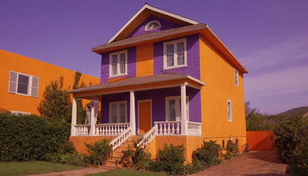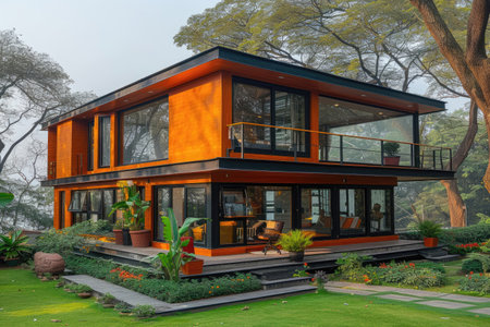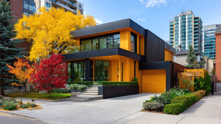 This image showcases a modern house featuring a striking black and orange exterior, set in an appealing urban landscape with colorful trees and well-maintained greenery.