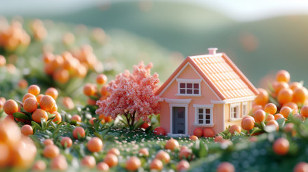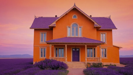 Minimalist illustration of a white house situated on a field of orange flowers, set against a pale blue sky. The house and the field are simple in design, making the scene feel calm and serene. The colors are soft and inviting.