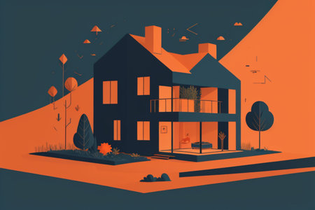 A stunning sunset silhouette showcases a house against a vibrant orange sky, capturing the warmth of dusk. The scene evokes tranquility and beauty, perfect for serene home imagery.