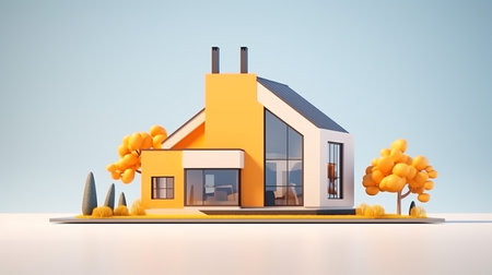 An AI generated illustration of an eco-friendly yellow house on green hillside