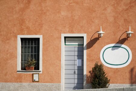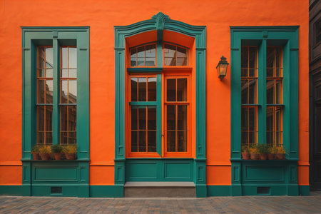 An eye-catching bright orange front door framed by light blue walls creates a striking contrast. Potted plants add a touch of greenery, enhancing urban aesthetics.