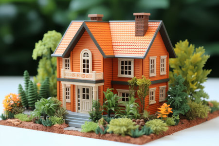 A small, orange house model sits on a white surface against a plain backdrop. The composition features sharp focus, suggesting a clean, modern aesthetic. The lighting is bright and even, casting soft shadows. This image could be used in advertising, web design, or editorial content related to home ownership.