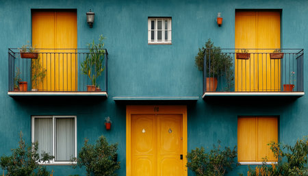 A teal building with multiple yellow doors and windows, showcasing vibrant color contrast.