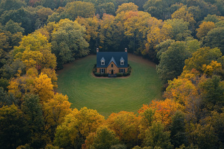 A charming house sits in a lush green clearing, encircled by vibrant autumn trees displaying hues of orange, yellow, and red, creating a picturesque fall landscape.