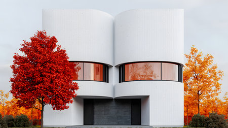A beautifully designed concrete house features fluid, organic shapes and large, orange-tinted windows amidst vibrant fall foliage, creating a harmonious atmosphere of modernity.