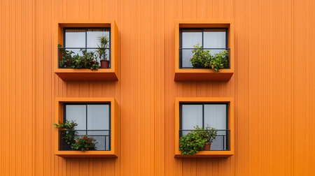 The image showcases a striking orange wall featuring four balconies adorned with vibrant plants. The atmosphere is lively and fresh, emphasizing a modern architectural aesthetic.