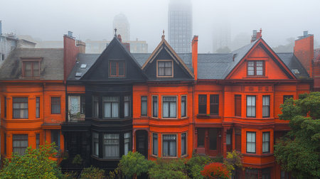 A photograph of the exterior view from an apartment window in downtown San Francisco, looking out at three-story buildings with large windows, overlooking a single tall building in the background. The architectural style is a mix of Victorian and modernist architecture, with red brick walls and black metal accents. It's a daytime scene with some fog. --chaos 30 --ar 16:9 --stylize 750 --v 6.1 Job ID: 8edbb806-c2f3-4afb-baf2-35d70878ddf6