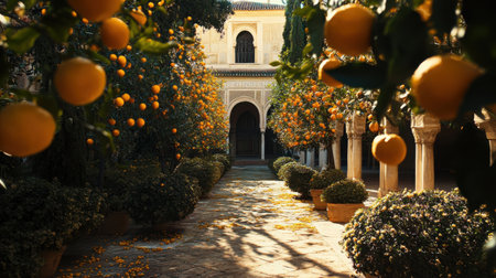 The tranquil pathway winds through a historic garden filled with orange trees, their branches heavy with ripe fruit, creating a vibrant atmosphere under the sun.