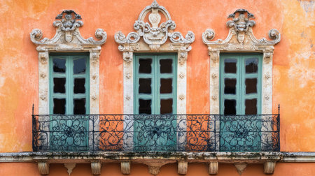 Beautifully crafted balcony showcasing vintage architecture against a warm wall, featuring intricate ironwork and picturesque windows that enhance the charm.
