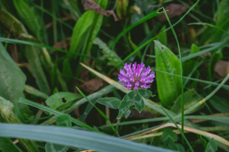 Photo depicts a colorful image of violet clover flower with a leaves on the meadow. Pink clover flower close up view, blurred green natural background.