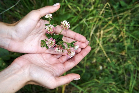 Female hands holding clover flowers on green grass background