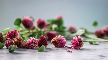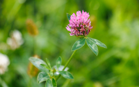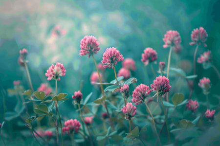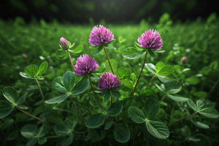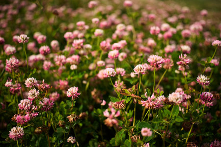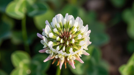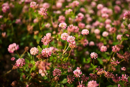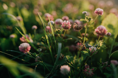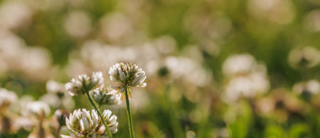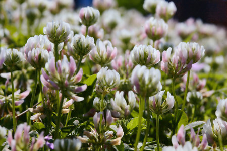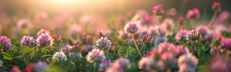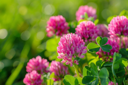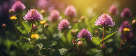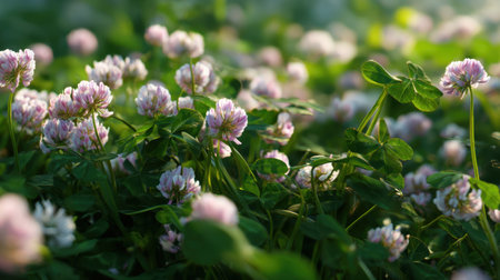 Beautiful clover flowers bloom in a lush green field during a sunny afternoon, highlighting nature