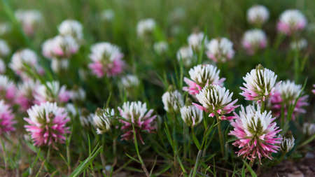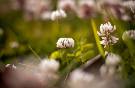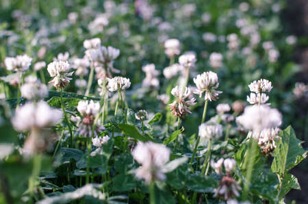 White clover flower field with depth of field effect. Trifolium repens the white clover also known as Dutch clover, Ladino clover, or Ladino, is a herbaceous perennial plant in the bean family Fabaceae
