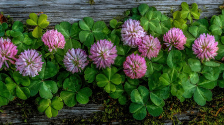This image showcases a collection of pink clover blossoms set against a backdrop of lush green foliage and weathered wood. The composition displays rich textures and natural tones, possibly shot in outdoor environment with soft lighting. Suitable for various editorial and commercial applications.