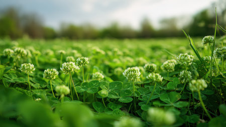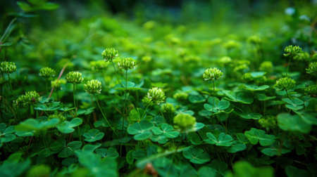 A captivating view of a lush green clover field featuring vibrant blooms and rich foliage. This serene outdoor scene captures the beauty of nature.