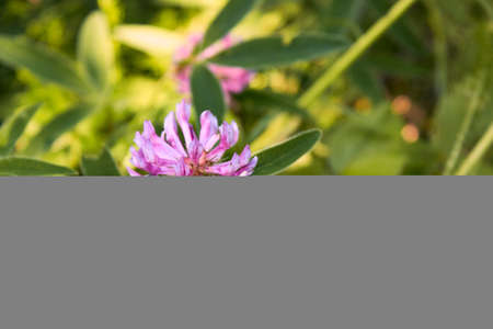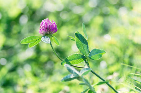 A blooming clover flower in a forest clearing close-up. Summer scene, pink-purple flower illuminated by the sun.