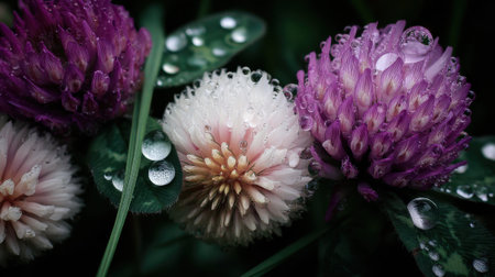 A stunning macro photograph capturing the intricate details of purple and white clover blossoms adorned with sparkling water droplets on a dark, moody background.