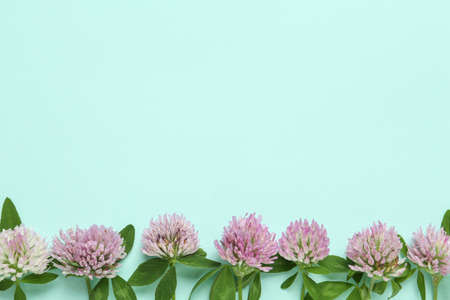 Beautiful clover flowers on turquoise background, flat lay. Space for text