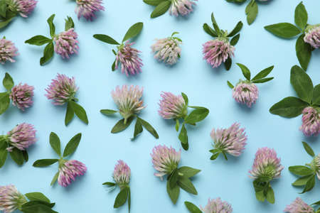 Beautiful clover flowers with green leaves on light blue background, flat lay