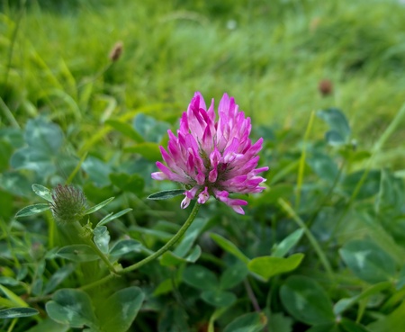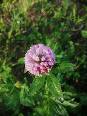 fine, wet after a rain, the flower of a pink clover grows in the field with a green grass,