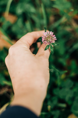 closeup of purple Clover flower in hand of woman
