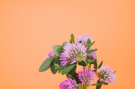 A closeup of a bouquet of red clovers isolated on an orange background with space for text