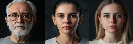 The image features three individuals of varying ages and ethnicities, each displaying a unique expression against a dark backdrop that highlights their features.
