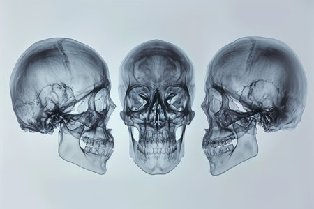 This photo features three x-ray images that depict different angles of the human skull, 3D X-ray interpretation of a human skull from different angles, AI Generated